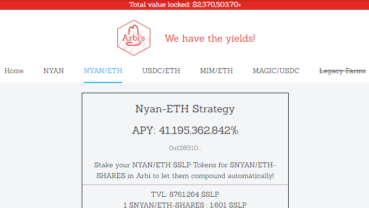 However, in the less well-travelled or should we say, more degen areas of crypto-land, you can find eye-popping APYs on altcoins, usually at the cost of significantly higher risk. For example, the diagram below is a screenshot from a yield farm on Arbitrum.