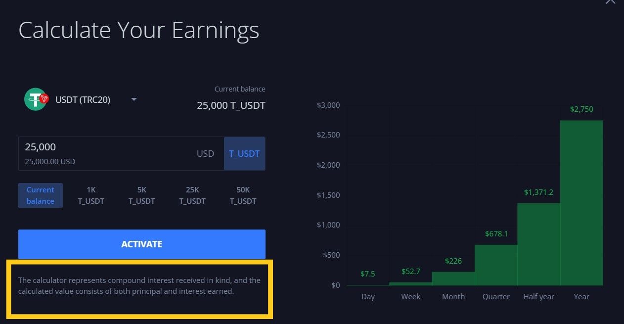 Platform B – At the end of the year, you will have a total of $11 050.65 USDT (initial investment sum of $10,000 + 1,050.65 in interest)