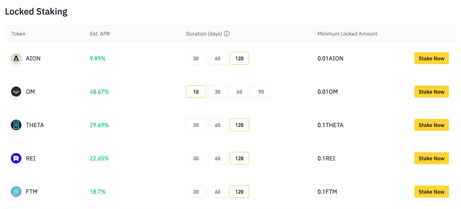 Binance is one platform that allows its users to stake a variety of tokens on their platform. As you can see in the diagram below, they present the estimated returns of staking there in APR rate, which means that what you receive is a simple daily reward which is not compounded.