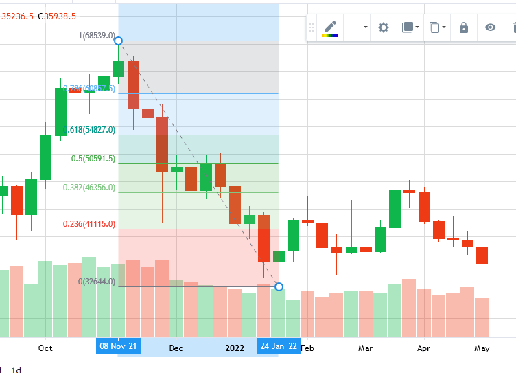 Fibonacci Retracement (FR) as an indicator originates from the well-known Fibonacci sequence. Fibonacci observed that there are natural ratios that exist and tend to influence how things occur. The crypto market is no exception thus the adoption of the Fibonacci Retracement levels. 0.236, 0.382, 0.618, and 0.764 are the four Fibonacci Retracement levels. It is clear from charts that prices retrace after a big breakout. Due to this fact, Fibonacci Retracement tries to predict how far the price will pull back before resuming its rise or fall. These points are the retracement levels, which then form support and resistance areas. In an uptrend, the prices pull back to a support level before rising again. Similarly, in a downtrend, the prices climb back to a resistance level before resuming the fall. Fibonacci predicts that the price will retrace to one or all the four levels before resuming the trend.