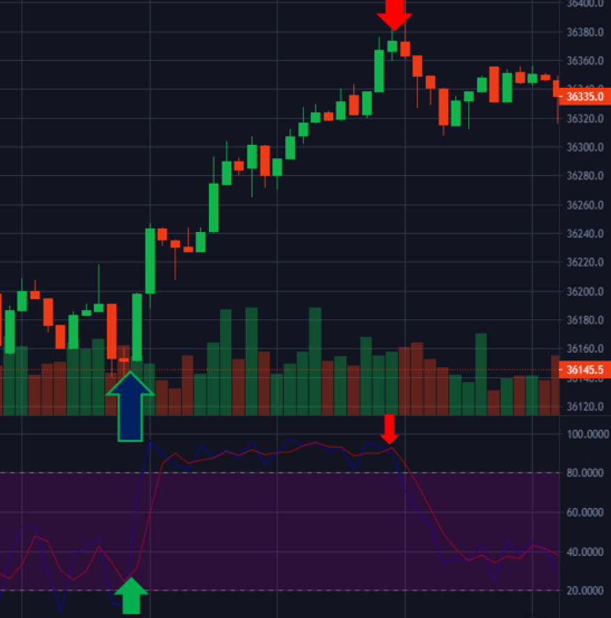 The market turns bullish as expected after SO reaches 20 on a downtrend. The opposite happens when SO rises above 80; the price falls.