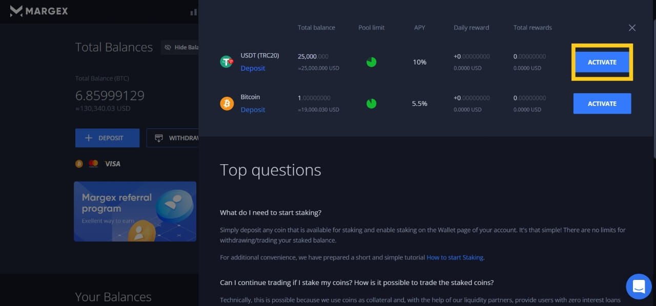 Simply log in to your Margex account, click “Try Staking” on the pop up window, deposit the coins you want to stake, and click activate on whichever coins you want to stake from the list of coins you have!