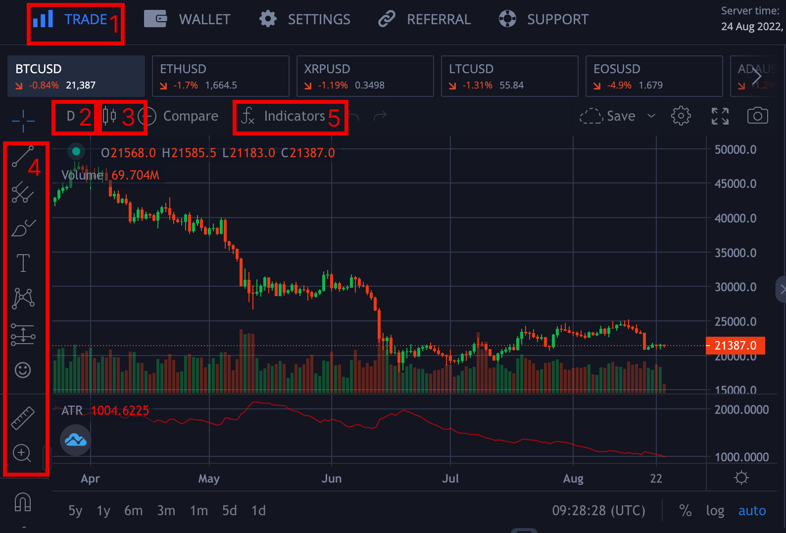 - Toolbar: The toolbar labeled four allows the trader to pick different technical tools for analysis ranging from trendlines, and horizontal lines, to drawing on the chart.