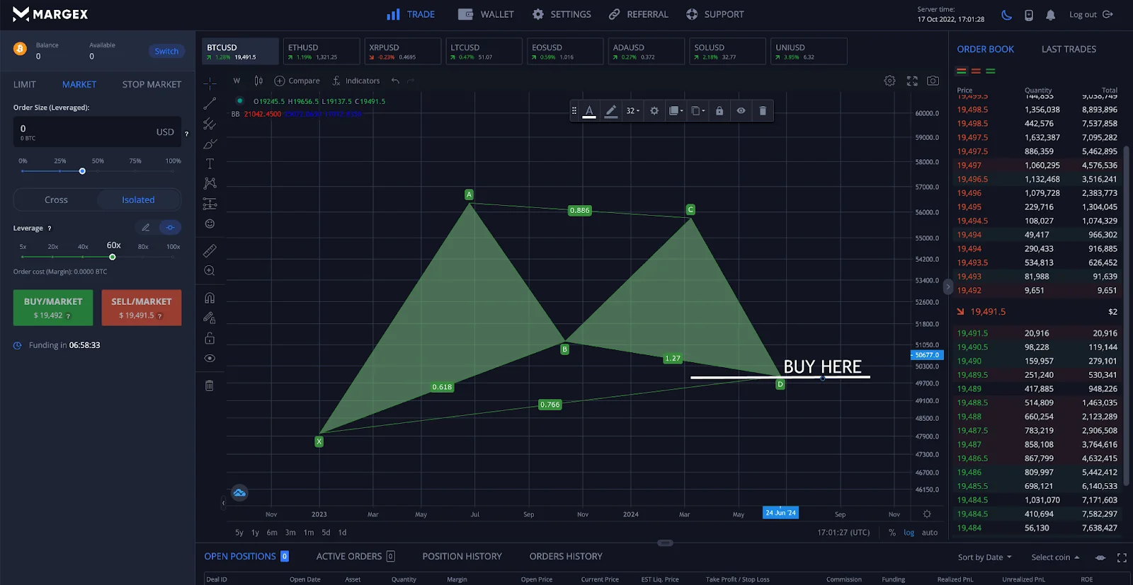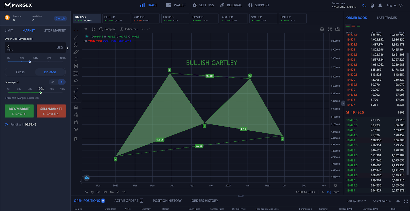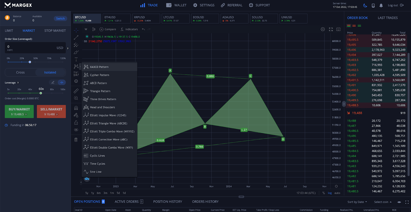 Margex includes access to both Fibonacci retracement tools, and the XABCD drawing tool that makes drawing harmonic patterns like the bullish or bearish gartley like a breeze.