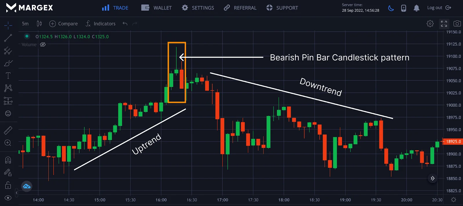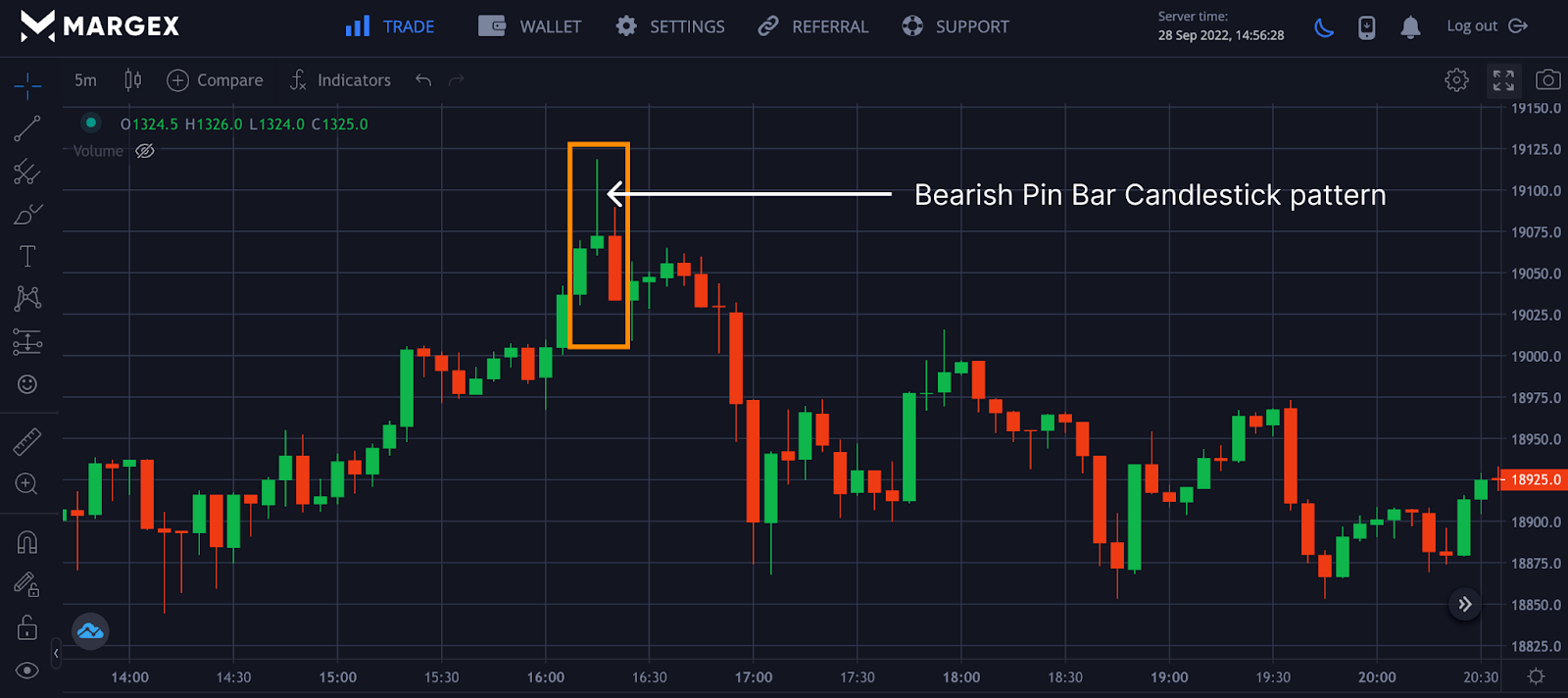 Having an account on Margex allows you to trade all the patterns we have discussed. The trade section of the Margex exchange gives you access to charts and real-time prices to put your skill into use. Let us see how to trade this bearish pin bar candle using the BTCUSD pair on Margex.