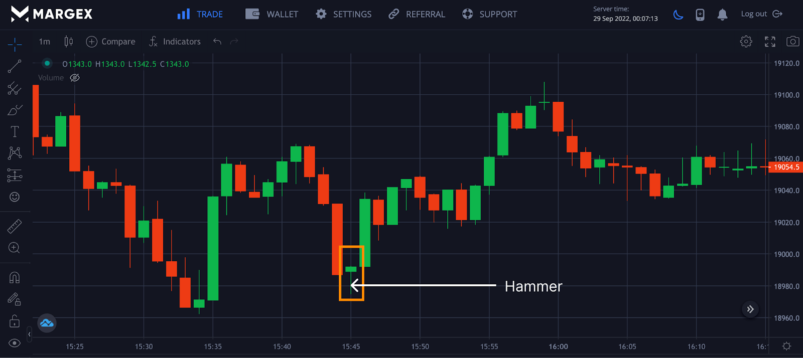 The chart above shows the formation of the Hammer, indicating price reversal from bearish to bullish with a confirmation of an uptrend.