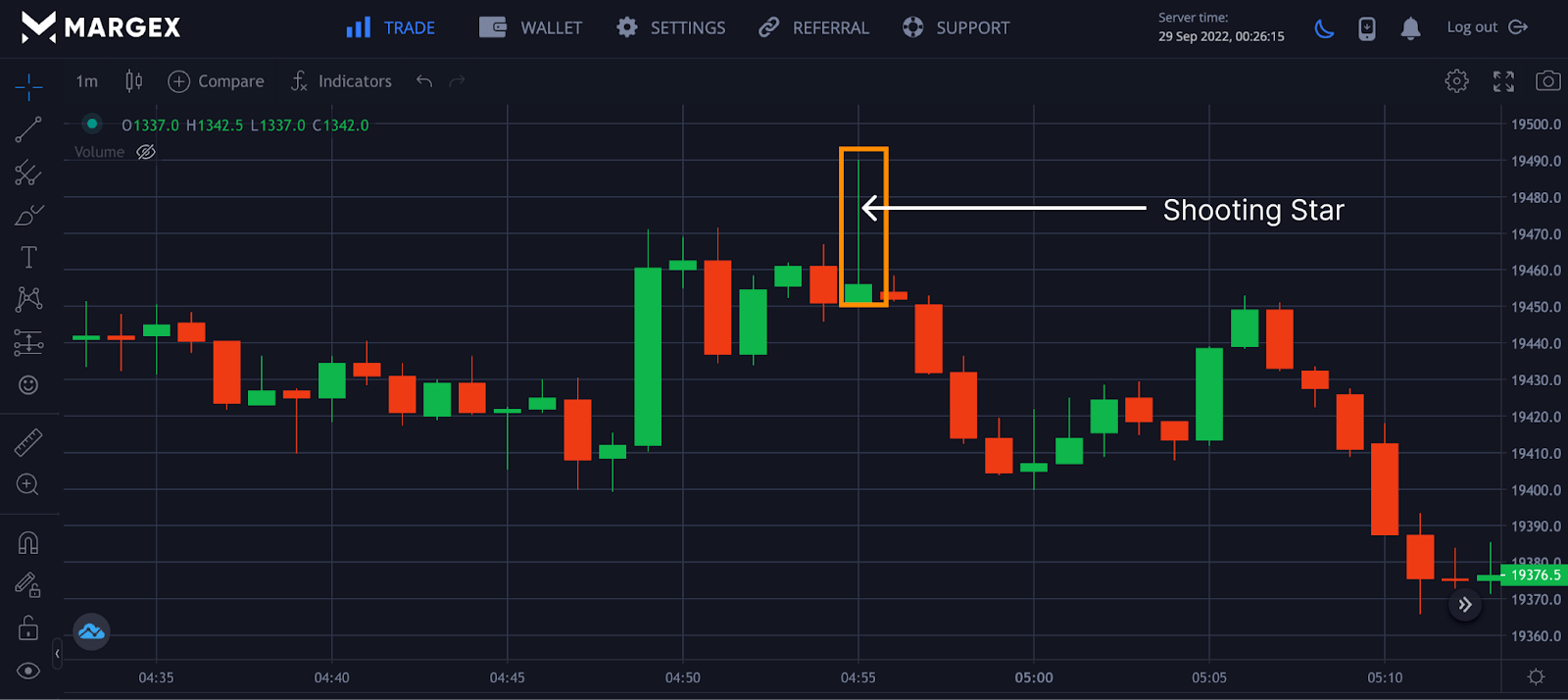 Another type of pin bar candle pattern is the shooting star bearish candle with a long, small body and little or no upper wick. This appears at the end of a trend to signal the end of the bullish run, as the price could be heading bearish in a short time.