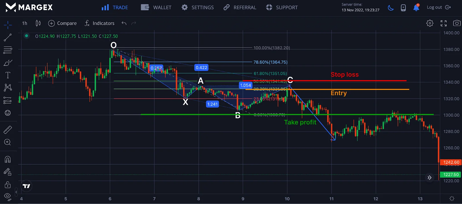 - The BC leg extends beyond the O point by 113% of the OX leg’s Fibonacci ratio.