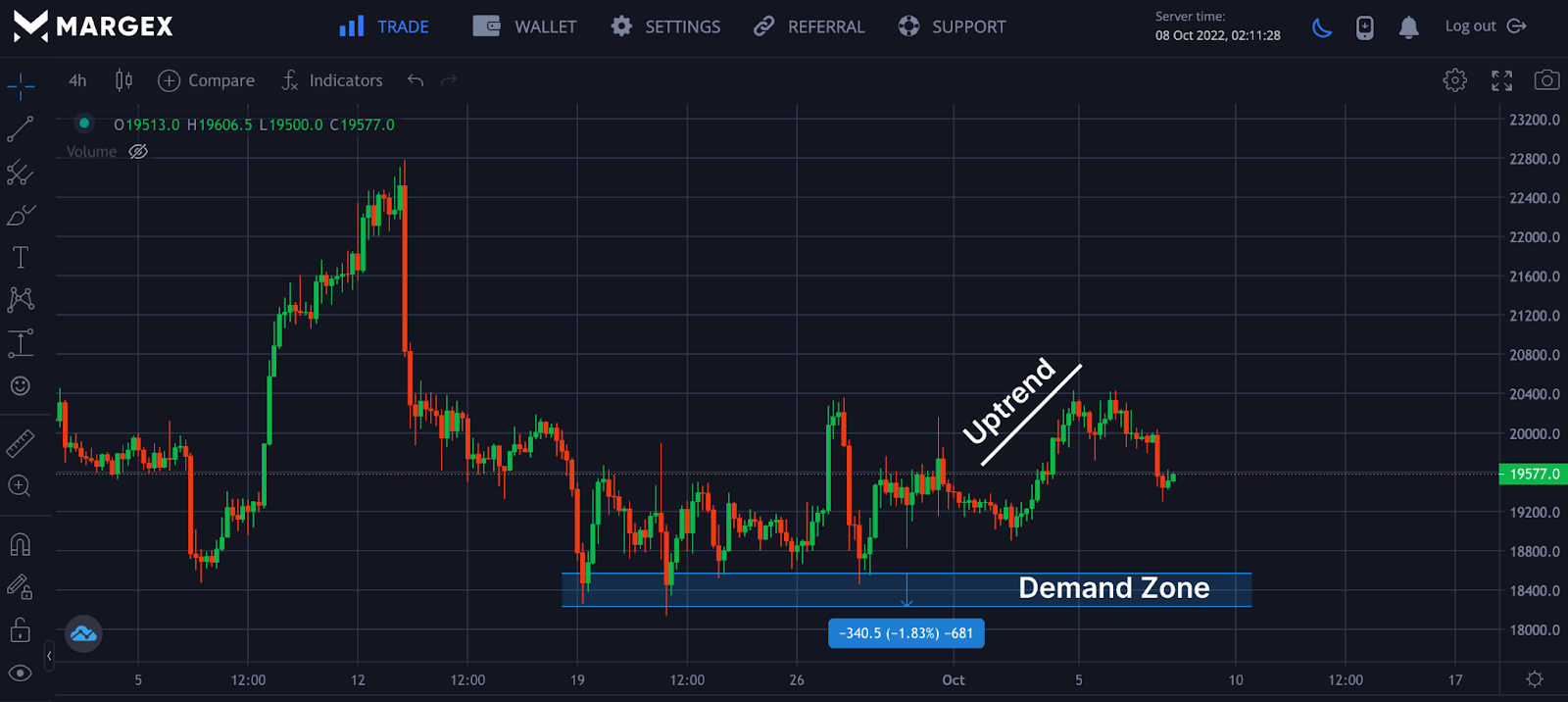From the chart above, the price of the BTCUSD pair formed a demand zone at around $18,400, with more buyers willing to buy at this range leading to price reversal whenever it touches this range.