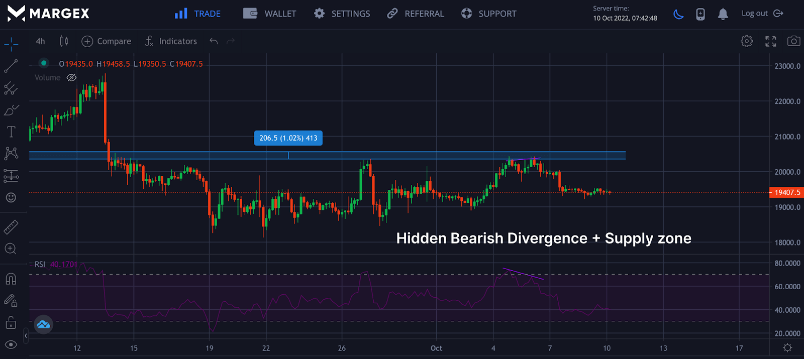 From the image above, the BTCUSD pair showed a hidden bearish divergence close to the supply zone, indicating a potential trend reversal was imminent in the four-hour timeframe. It would be wrong to open a long position at the supply zone unless this area was breached or flipped into a demand zone. A good trader would look for a short opportunity when all criteria have been fulfilled for that trade.