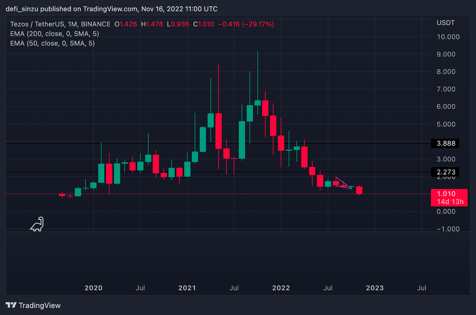 The chart shows the price of XTZ falling by over 75% against Tether (USDT) from a high of $9.12.
