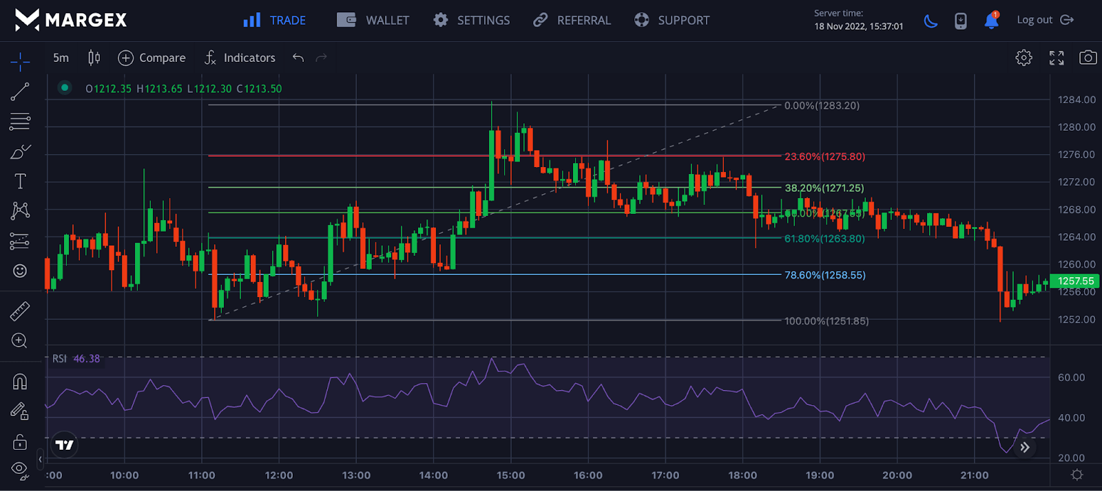 A trader could open a short position at this level, setting a stop loss above 23.6% and taking a profit at about 61.8% to 78.6%.