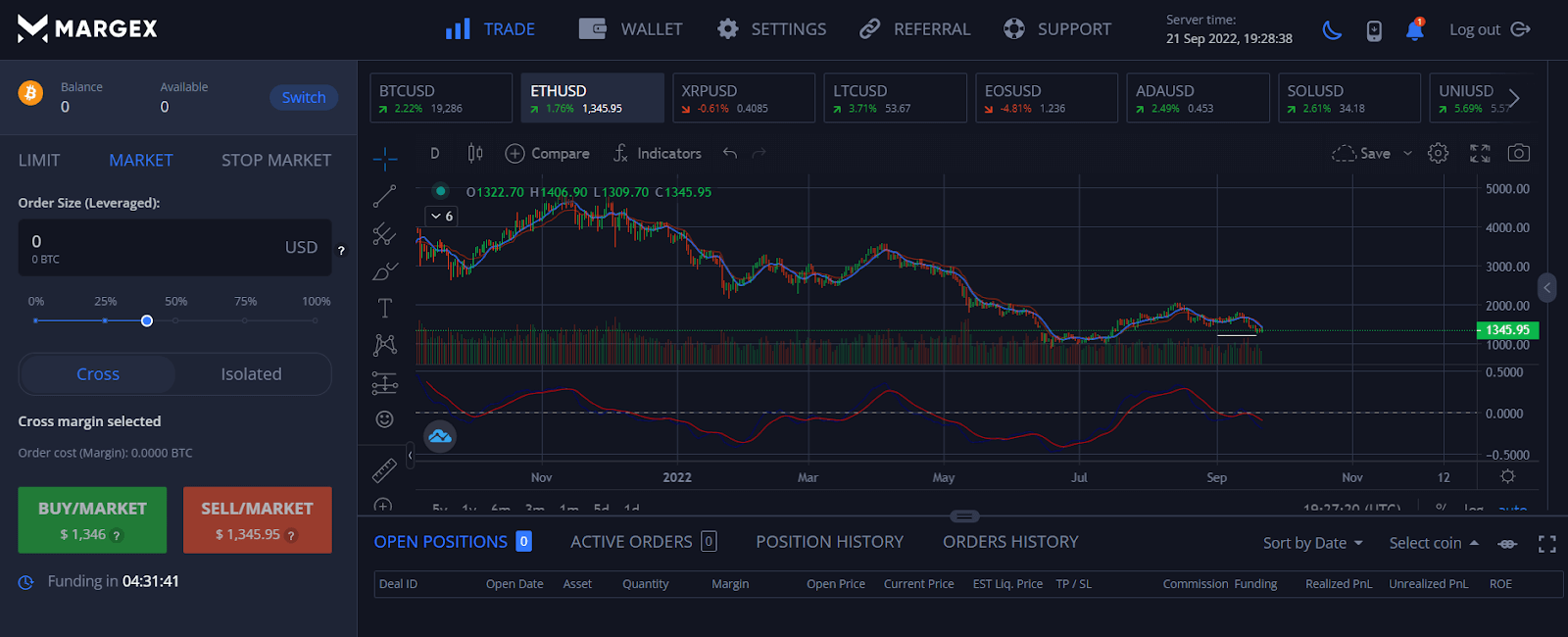 An illustration of Ethereum’s daily chart showing the moving average indicator on the Margex platform