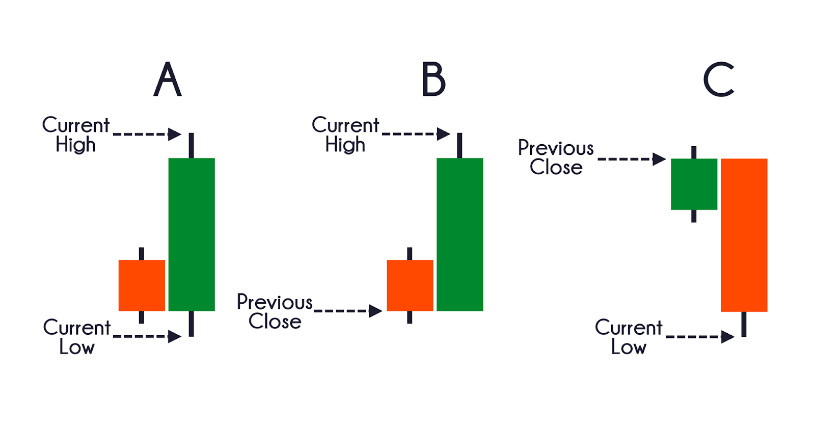 - The difference between the current high and the previous close