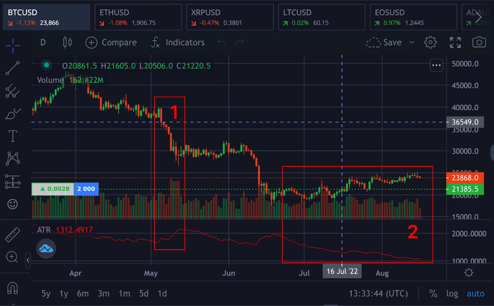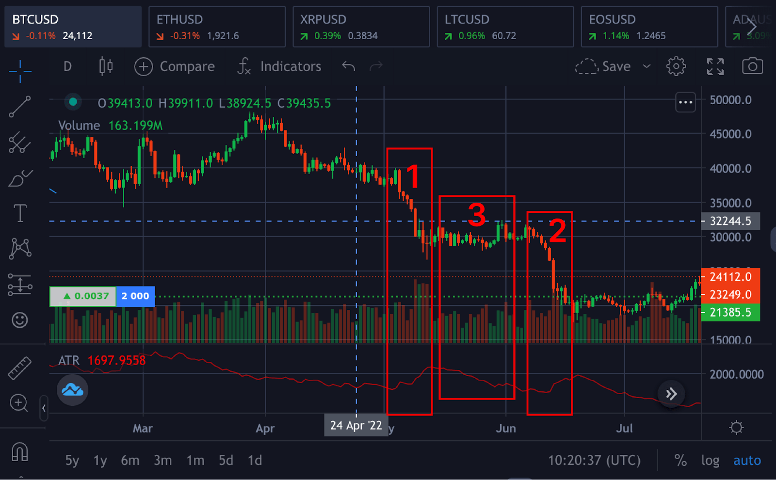 The crypto market is highly volatile, changing from a region of low volatility to a region of high volatility and vice versa; the average true range can be used to determine explosive breakout trades and exits after the trend. The average true range can be applied in all financial markets, forex, crypto, or others.