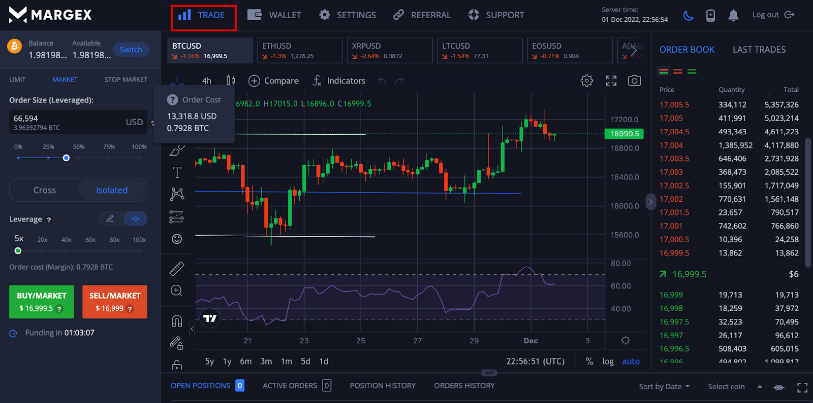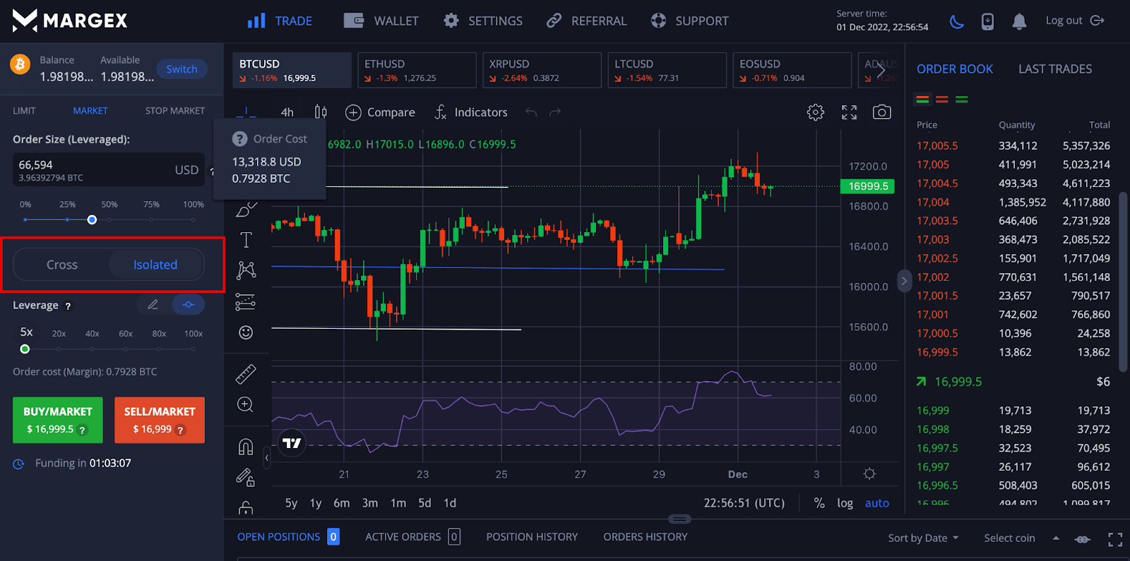 Click on the trade tab to access all of the Margex trading features, including the future interface that contains the cross and isolated-margin tab.