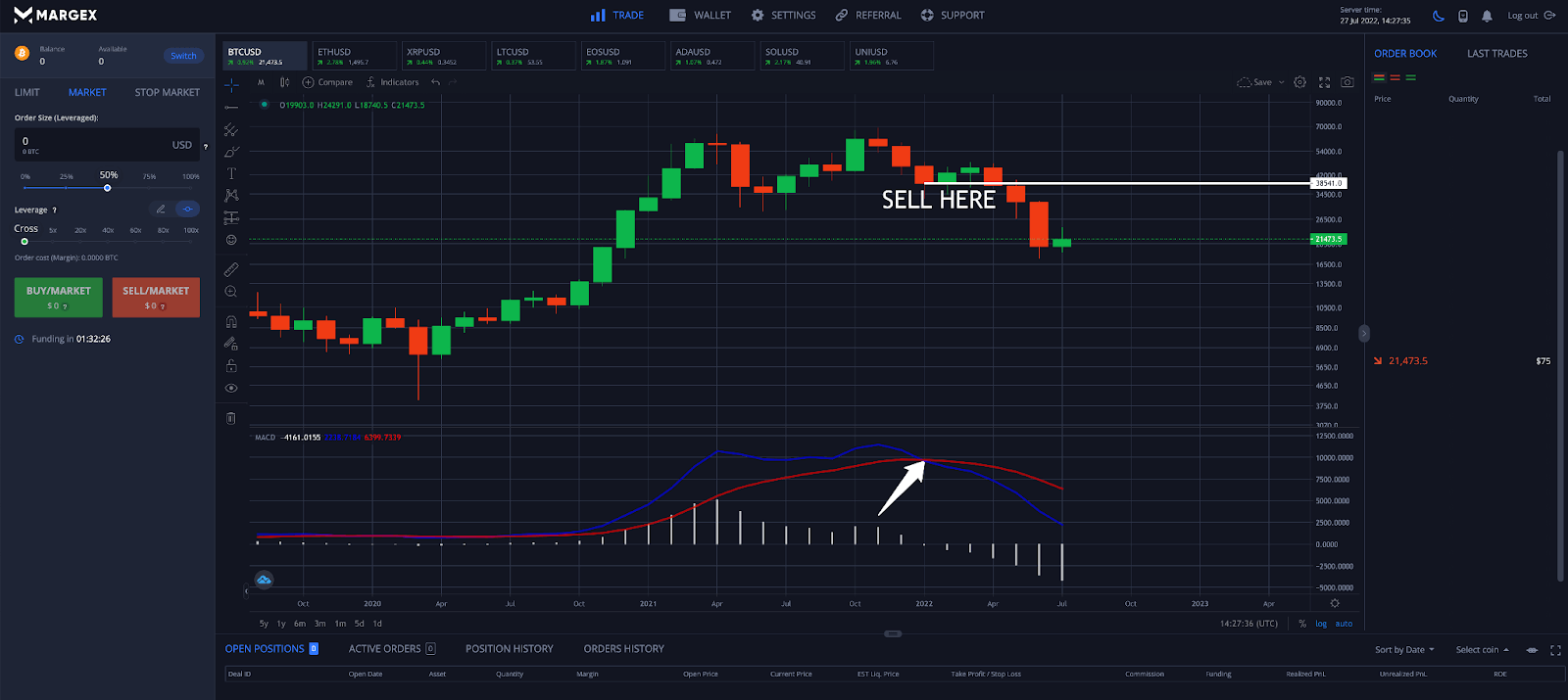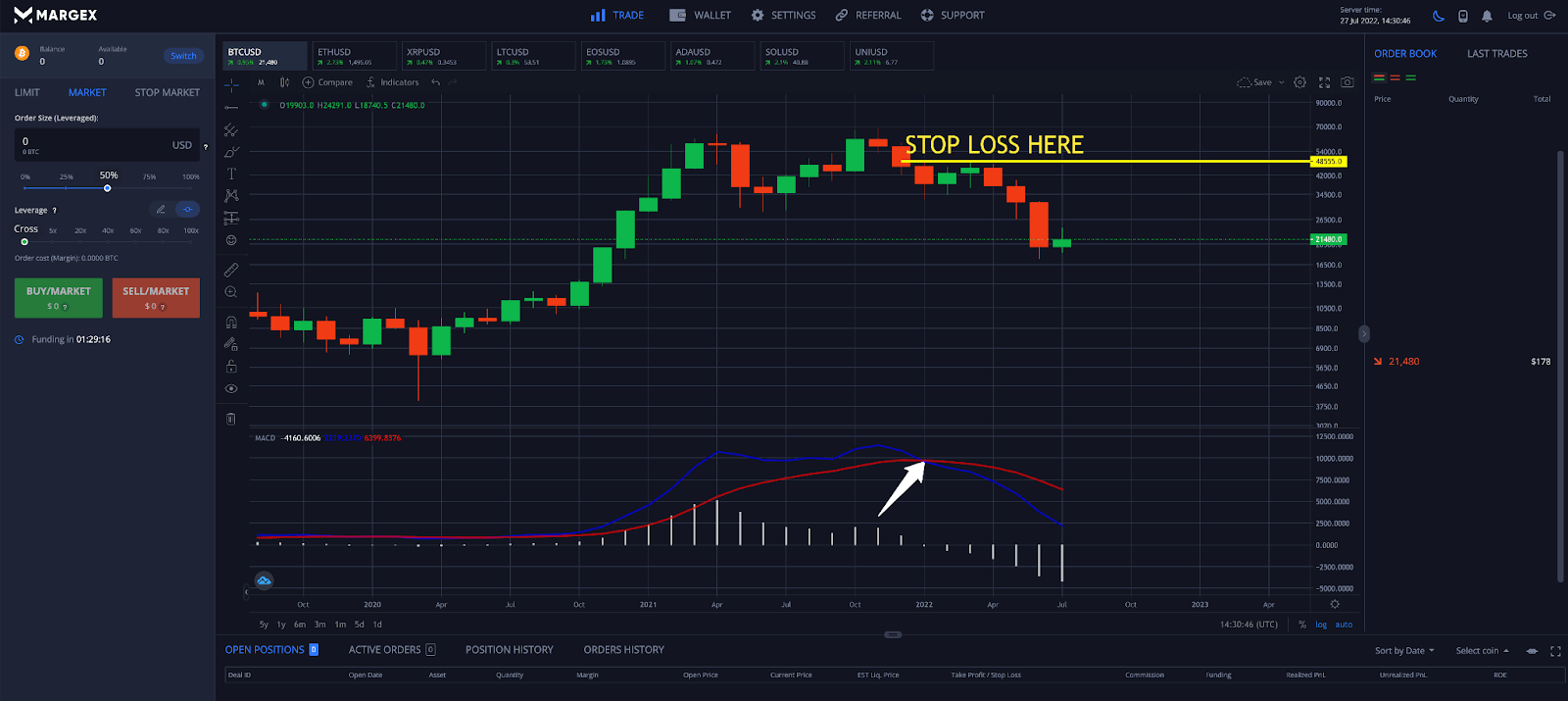 Step 3 – Place a stop loss order above the candle where the crossover occurs when the MACD crosses bearish. BTC dropped another 50% from where the sell order was placed and the stop loss was never triggered.
