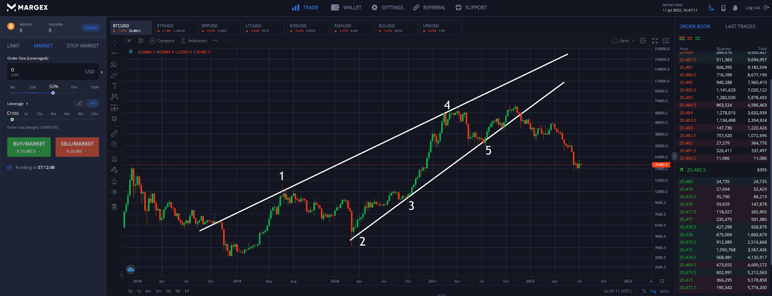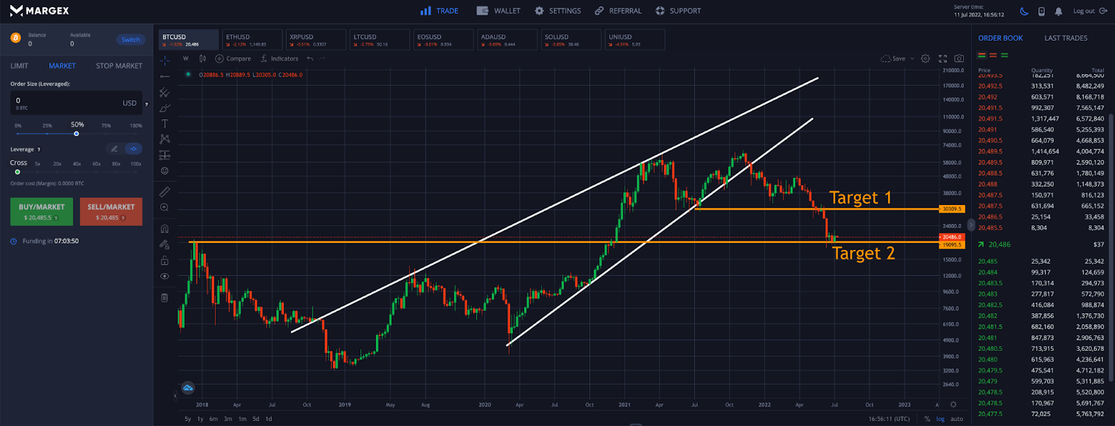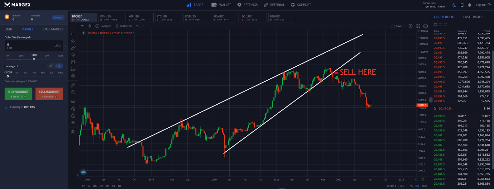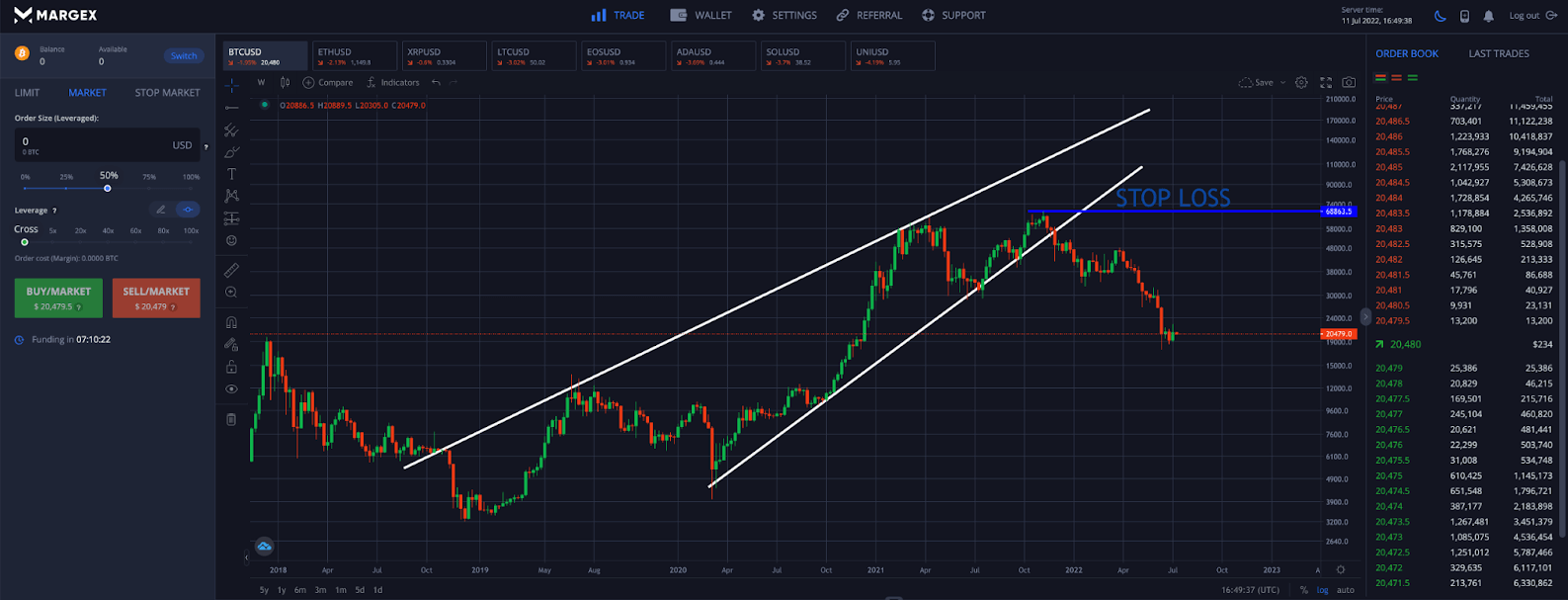 The Margex trading platform includes powerful technical analysis tools built directly into the platform. This allows traders to properly identify and successfully trade a rising wedge pattern. Here are the steps necessary to trade the pattern.