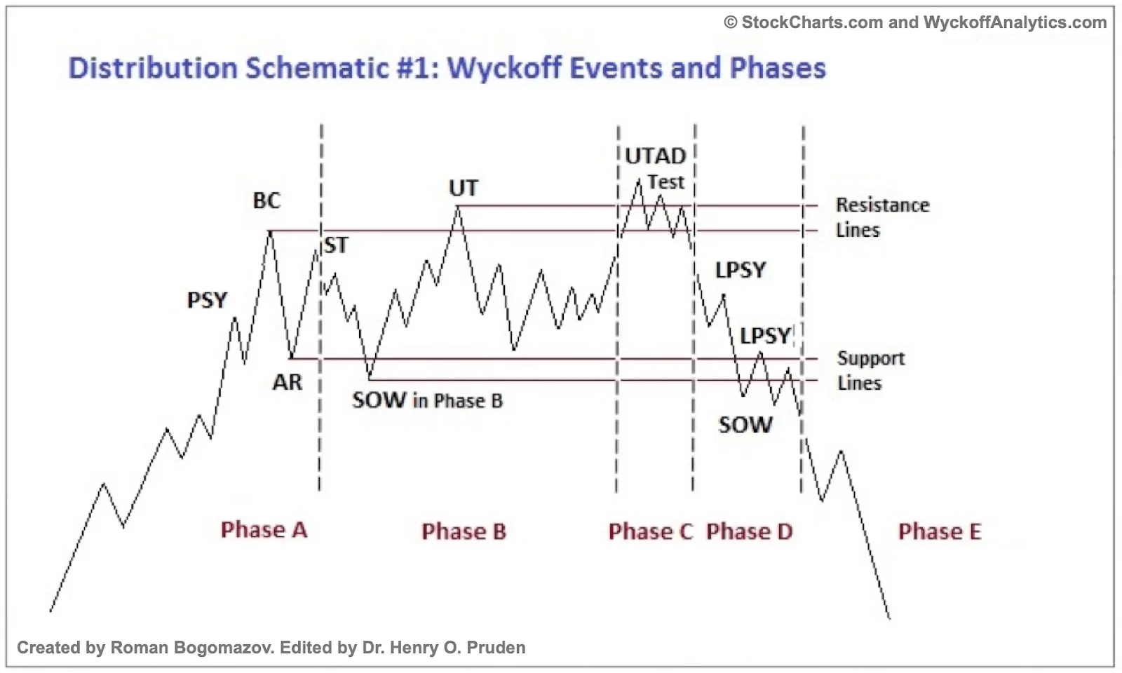 Here is an explanation of the events and phases that occur within the Wyckoff distribution schematic. Note: TRs represent trading ranges.