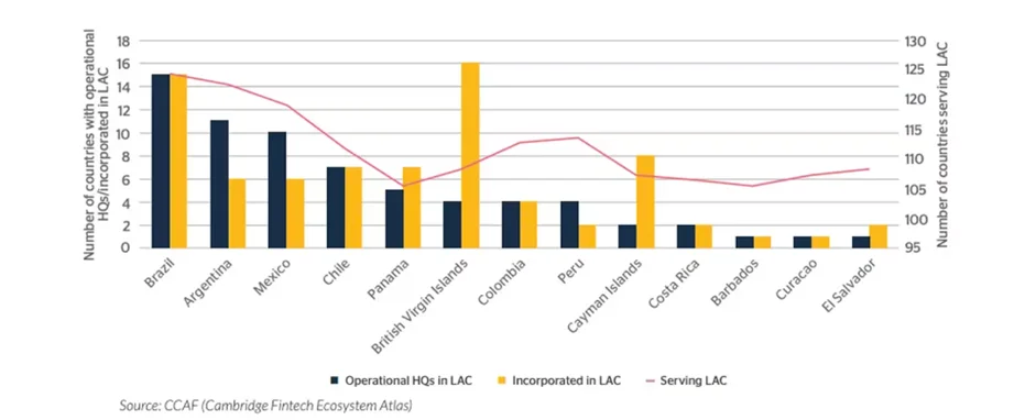 Riguardo alla distribuzione di queste aziende Fintech di cripto-asset nella regione, il rapporto sottolinea la loro natura disuguale, anche se vi è una concentrazione nei centri economici del Brasile (15), dell’Argentina (11) e del Messico (10). Inoltre, destinazioni esotiche come le Isole Vergini britanniche e le Isole Cayman compaiono anche nella lista dei paesi in cui sono state fondate aziende di cripto-asset, probabilmente a causa dei vantaggi fiscali offerti a queste entità.