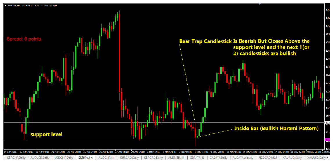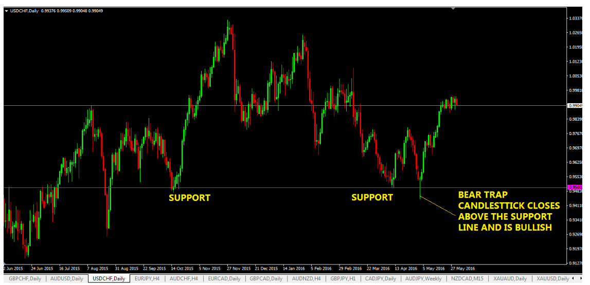 Questo grafico presenta una candlestick rialzista su una bear trap che rompe il livello di supporto e scende, ma alla fine chiude sopra la linea di supporto formando una candlestick rialzista.